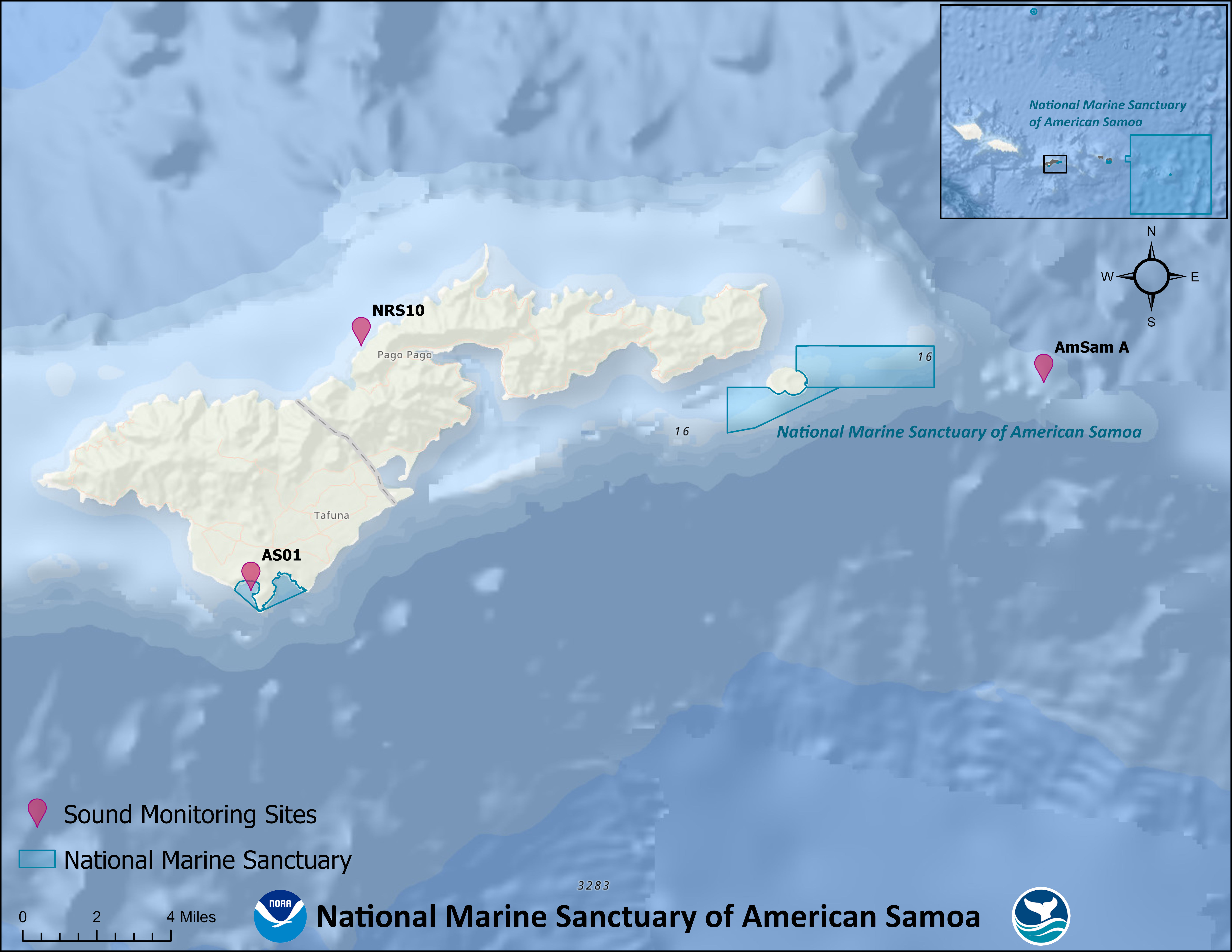Ocean sound monitoring coordinated by ONMS began in 2023 through the ONMS Sound program, building on historical efforts to characterize the underwater soundscape around American Samoa. Current monitoring and analysis are conducted at one site (AS01) within NMSAS. In addition, two monitoring sites located outside of sanctuary boundaries provide broader context: the Noise Reference Station (NRS 10), established in 2015, and a NOAA Fisheries deep-water site (AmSam) deployed in 2023. Together, these sites support long-term monitoring of soundscape conditions both inside and outside the sanctuary to help inform sanctuary management.
