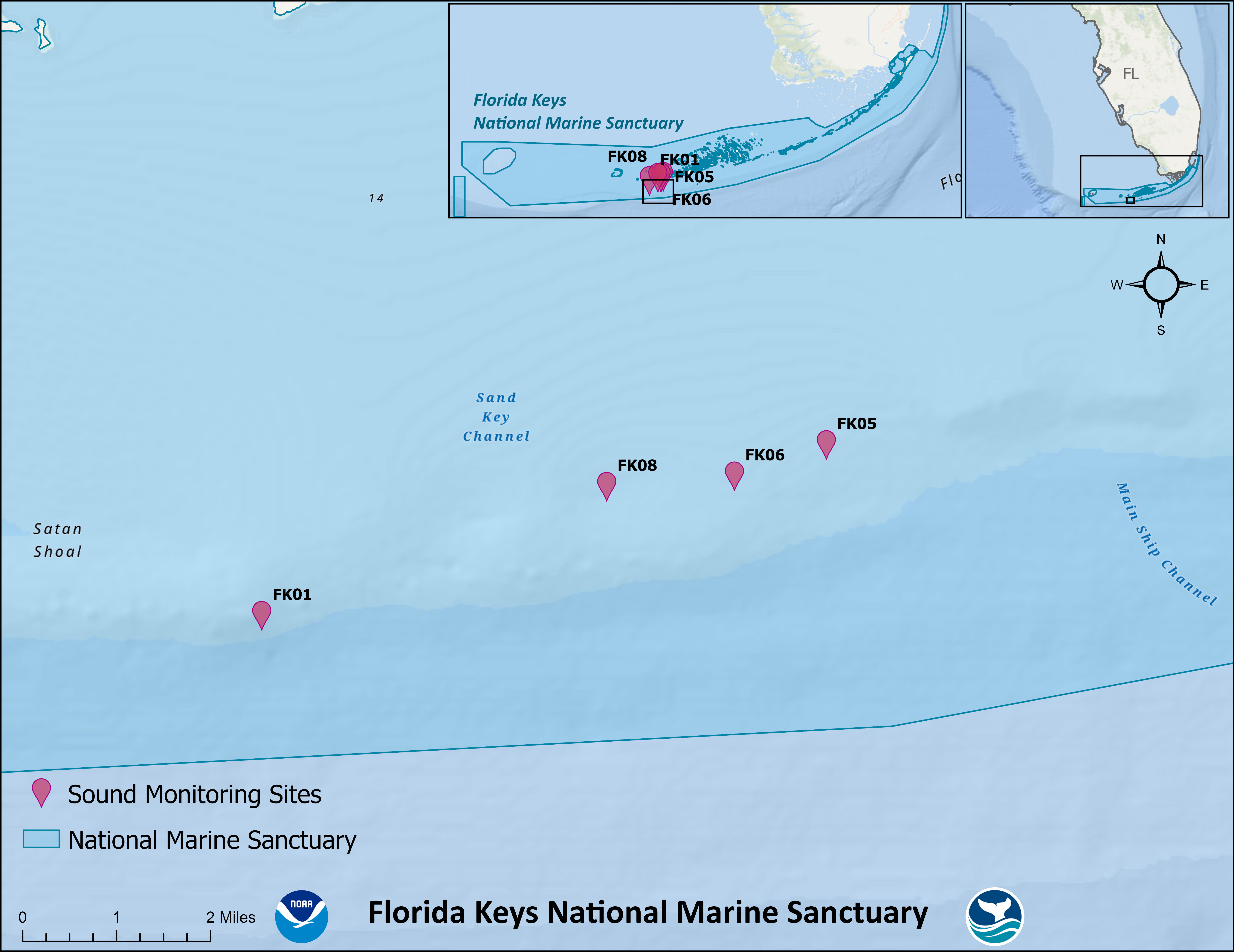 Current ONMS ocean sound monitoring and analysis is maintained at four sites (FK01, FK05, FK06, and FK08) within the coral reef tract of the lower keys. Collectively, these sites are being monitored for sounds produced by spawning fishes, such as groupers, snapping shrimp, and vessels to further understand the biological productivity of reef inhabitants and stakeholder use of these unique reefs. The comparison of sound with additional datatypes, such as temperature data and restoration activities, is also being explored to examine how soundscapes respond to environmental and habitat conditions in the context of different spatial and temporal management strategies.