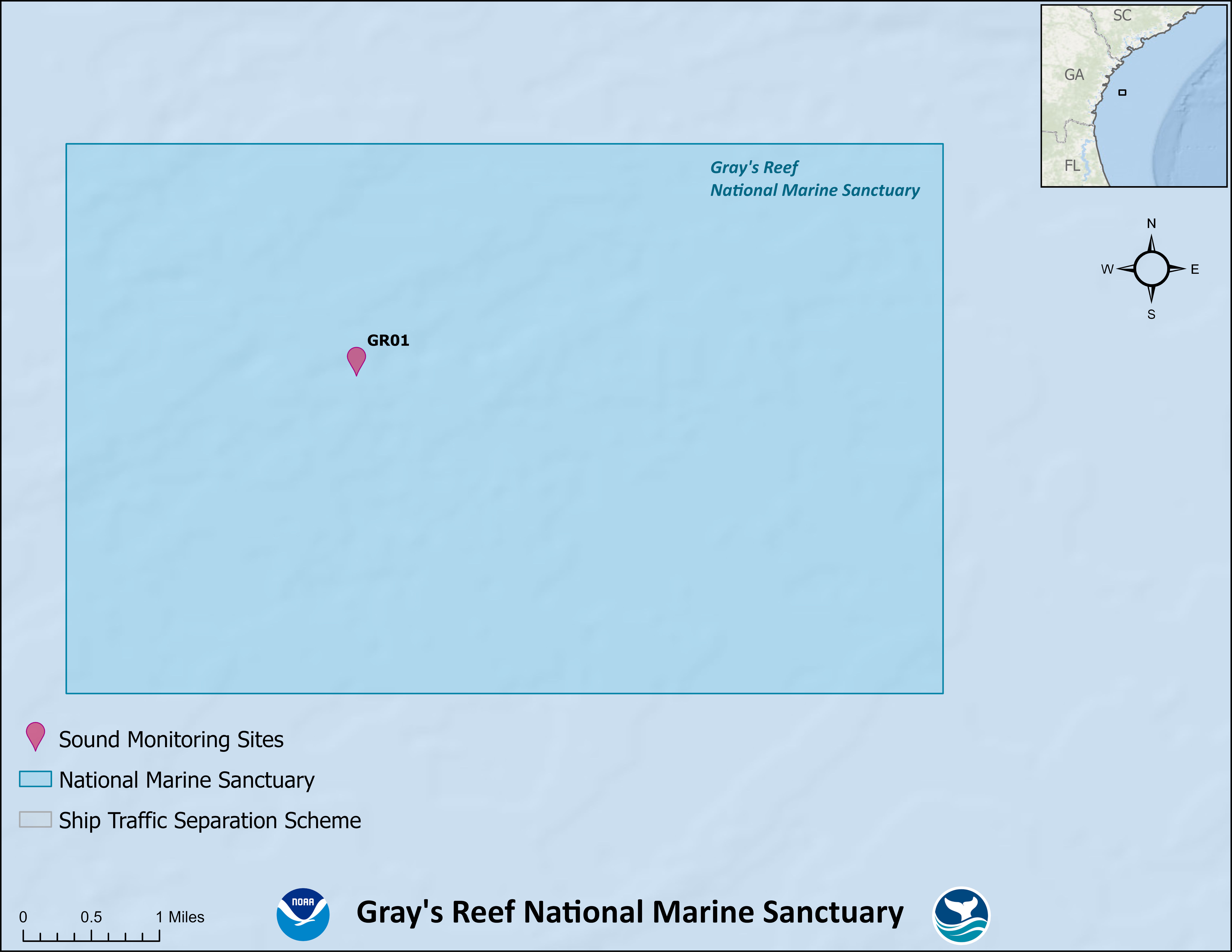 The Gray's Reef National Marine Sanctuary (GRNMS), located off the coast of Georgia is one of the largest live-bottom reefs in the southeastern United States, where rocky ledges are colonized by sponges, soft corals, and other invertebrates, providing a biologically rich habitat in an area otherwise characterized by large swaths of sandy seafloor. Cherished for its biological diversity, visitors travel to GRNMS to recreationally dive and fish outside of the Research Area, which are activities that were the focus of previous sound monitoring in the sanctuary. Multiple sites in the sanctuary were part of the Sanctuary Soundscape Monitoring Project, a 5-year (2018-2022) system-wide monitoring project to understand the diversity of sounds in sanctuary waters.
