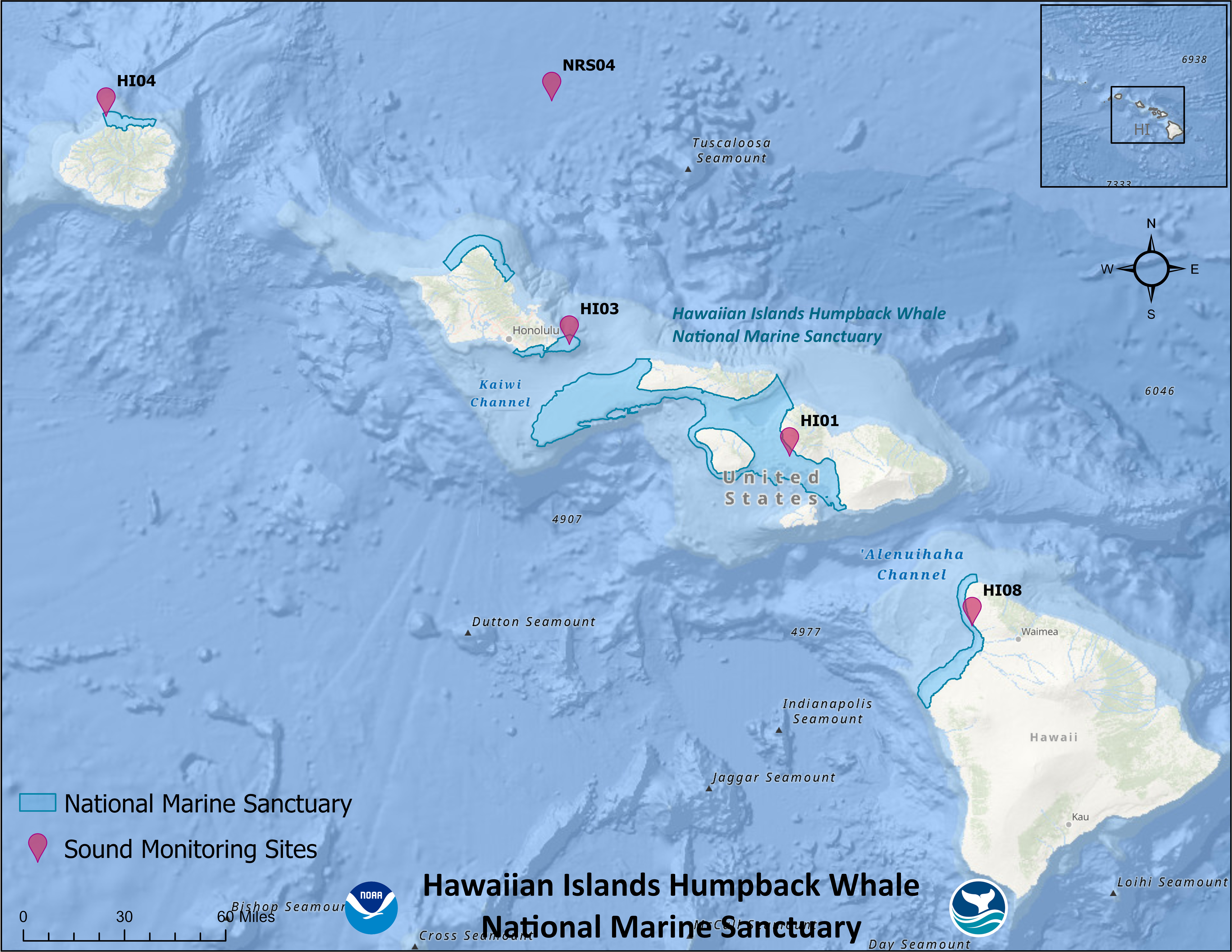 Current ONMS ocean sound monitoring and analysis is maintained at four sites within HIHWNMS. These sites (HI01, HI03, HI04, HI08) continue to support monitoring of humpback whale migration and habitat use patterns as well as vessel traffic from commercial activities, including whale watching. In addition, one monitoring site outside sanctuary boundaries, the Noise Reference Station (NRS 04), established in 2015, provides a baseline for ocean sound conditions beyond the sanctuary.