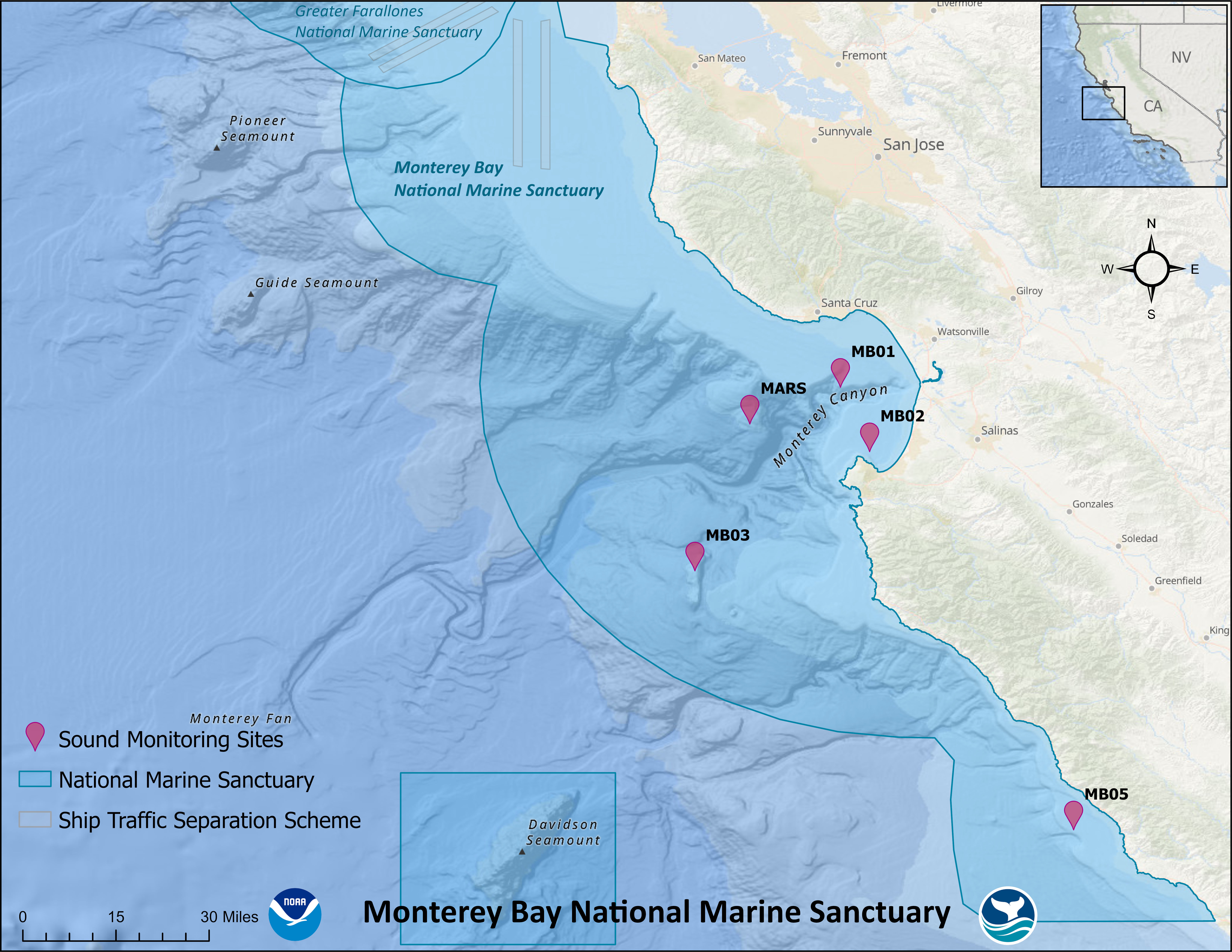 Ocean sound monitoring in Monterey Bay National Marine Sanctuary (MBNMS) coordinated by ONMS began in 2018 through the Sanctuary Soundscape Monitoring Project. This sanctuary has a long history of underwater acoustic monitoring dating back to measurements in the 1950s by the U.S. Navy near Point Sur Ridge. The Monterey Bay Aquarium Research Institute (MBARI) supports a continuous real-time monitoring effort within the sanctuary that began in 2015, known as the Soundscape Listening Room. Collectively, these underwater sound monitoring efforts have provided key insights on cryptic species, whale migration patterns and drivers, methods for detecting fish sounds, and steady rise in ocean noise levels, to highlight a few.