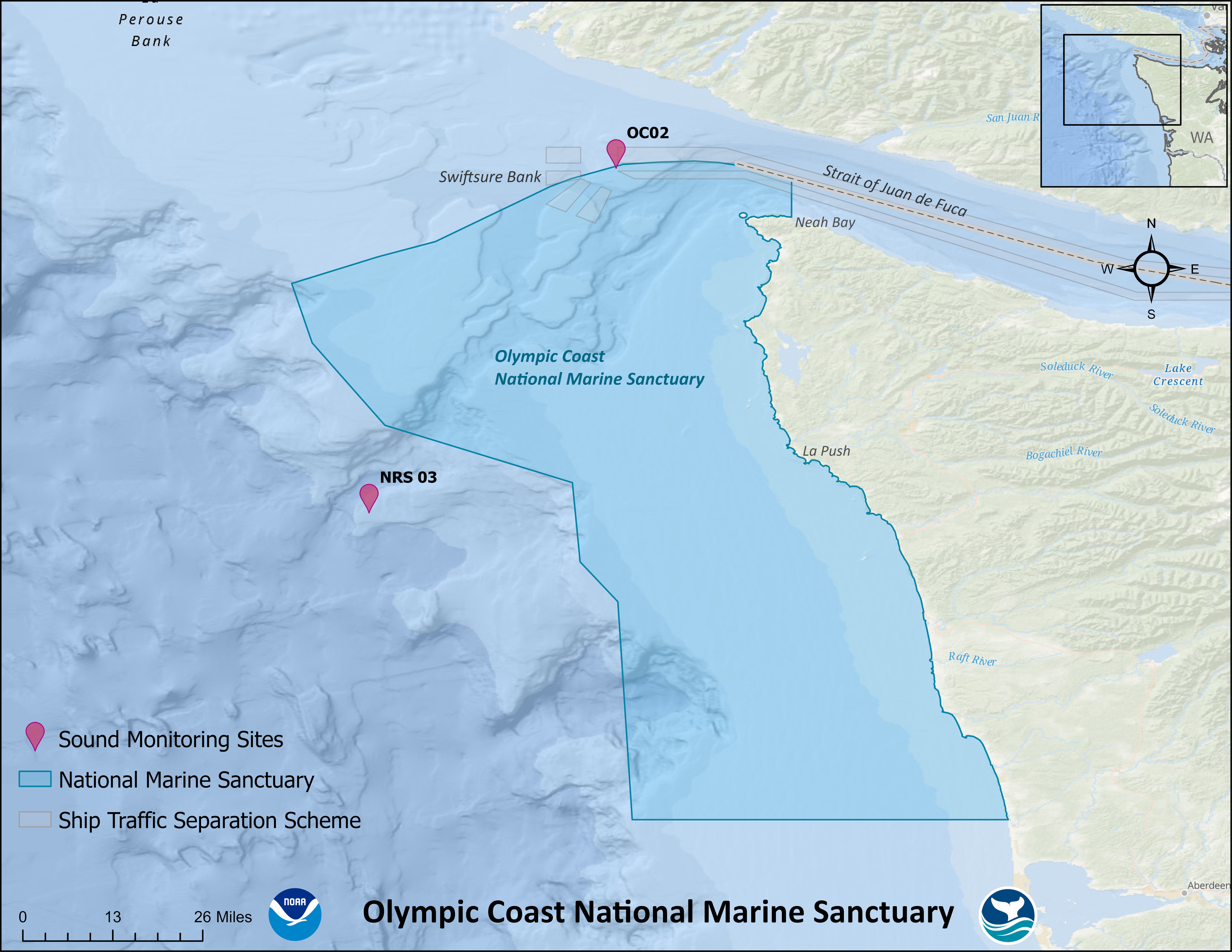 Current ONMS ocean sound monitoring and analysis is maintained at two sites. Monitoring at OC02, near Swiftsure Bank, started in 2019. In this area, vessel traffic and whale activity dominate the soundscape, which is the middle of major shipping lanes on the international border, adjacent to a military testing range and inside Southern Resident Killer whale and humpback whale critical habitat. And, the Noise Reference Station site (NRS03) is a deep water site that captures large whale and orca activity offshore and is to the west of the traffic zones for commercial vessels transiting in/out of the Strait of Juan de Fuca. It monitors the northwestern area of the sanctuary, including for Naval testing and training activity.
